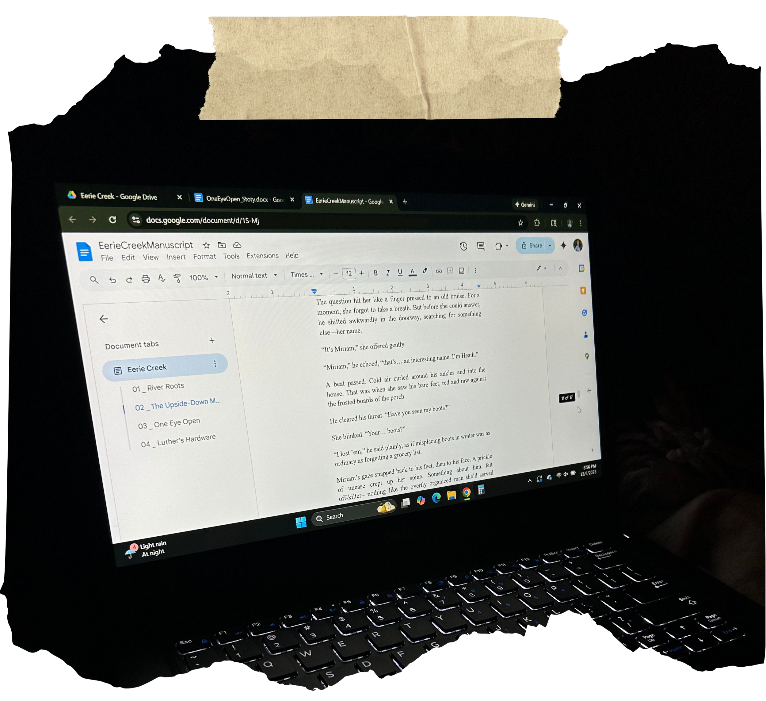 Welcome to the quiet in-between. Here you’ll find progress photos, story fragments, and moments from the making of Eerie Creek. From drafts to visuals to author snapshots, this space documents how the stories emerge, layer by layer, as it begins to take shape. I will add to this section occasionally, so touch back!